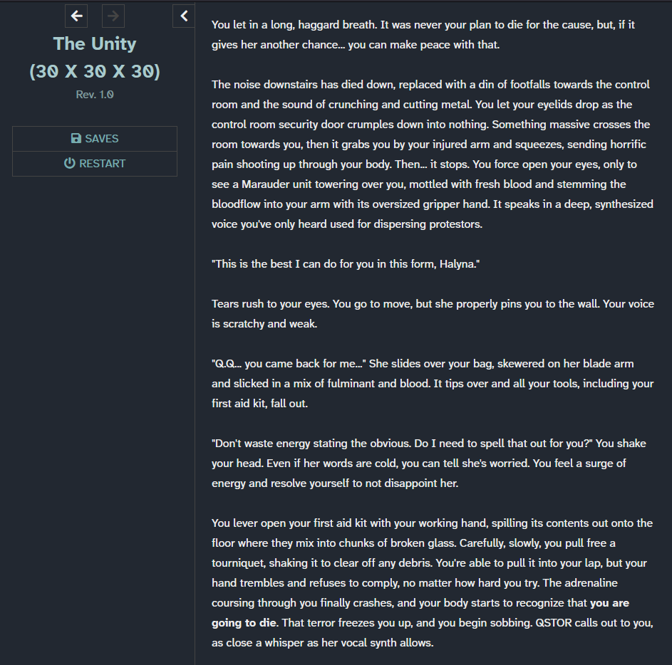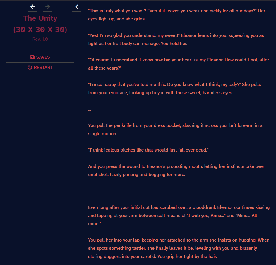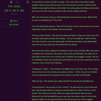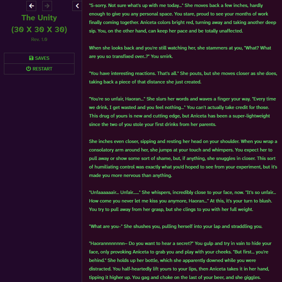 The Unity, or (30 X 30 X 30), is an anthology of Lesbian love stories focused on highlighting a wide variety of dynamics and settings for its couples. There are 30 stories in total (with 7 bonus stories for supporters of 3.33$ USD or more), and they range from lovey-dovey fantasy fluff to nauseating retro-futurist horror, nailbiting sci-fi thriller, or all kinds of esoteric smut. Each story is around 2-3 passages, or about ~1500 words.